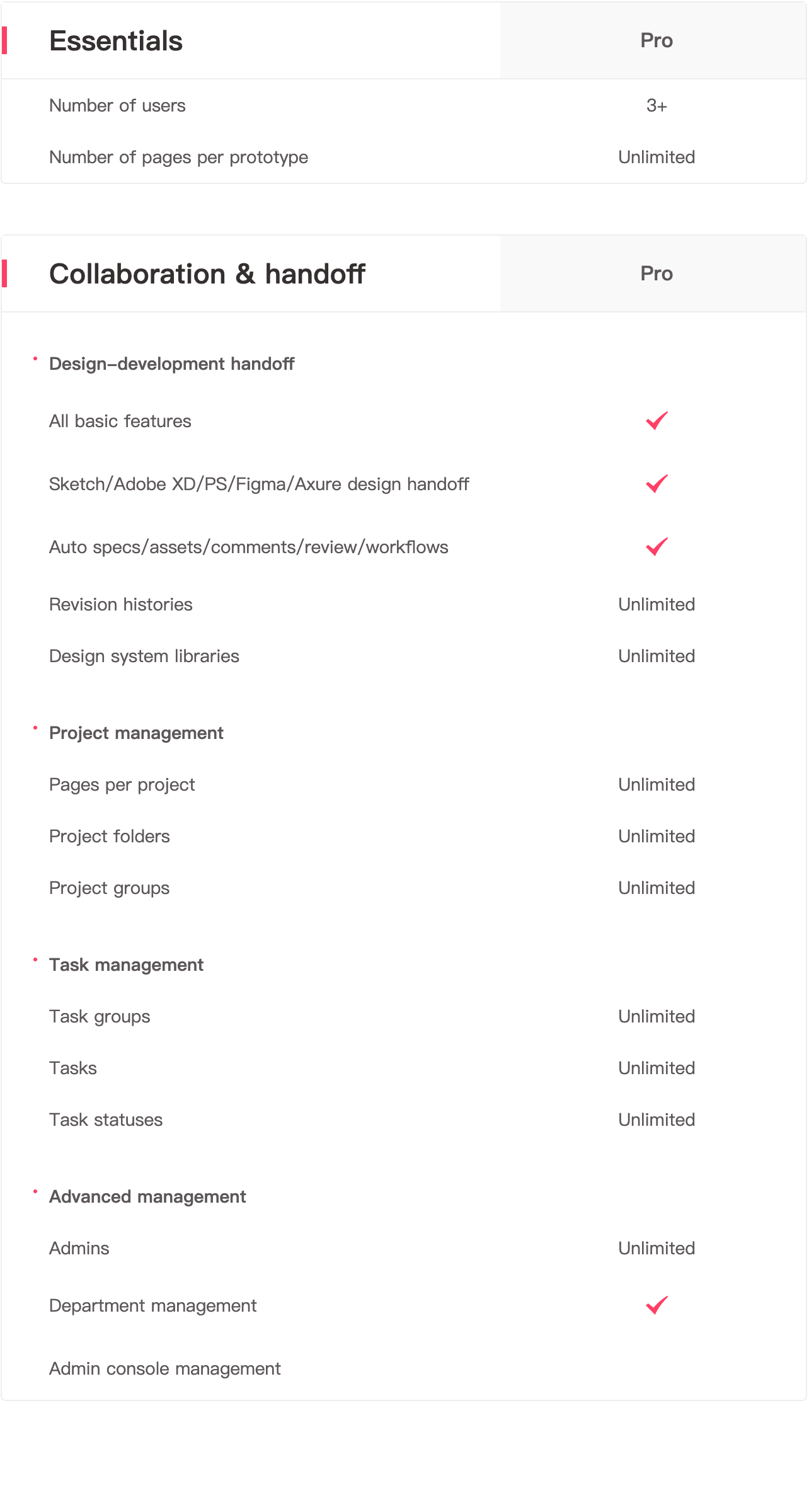 Number of pages per prototype 10 Unlimited Unlimited